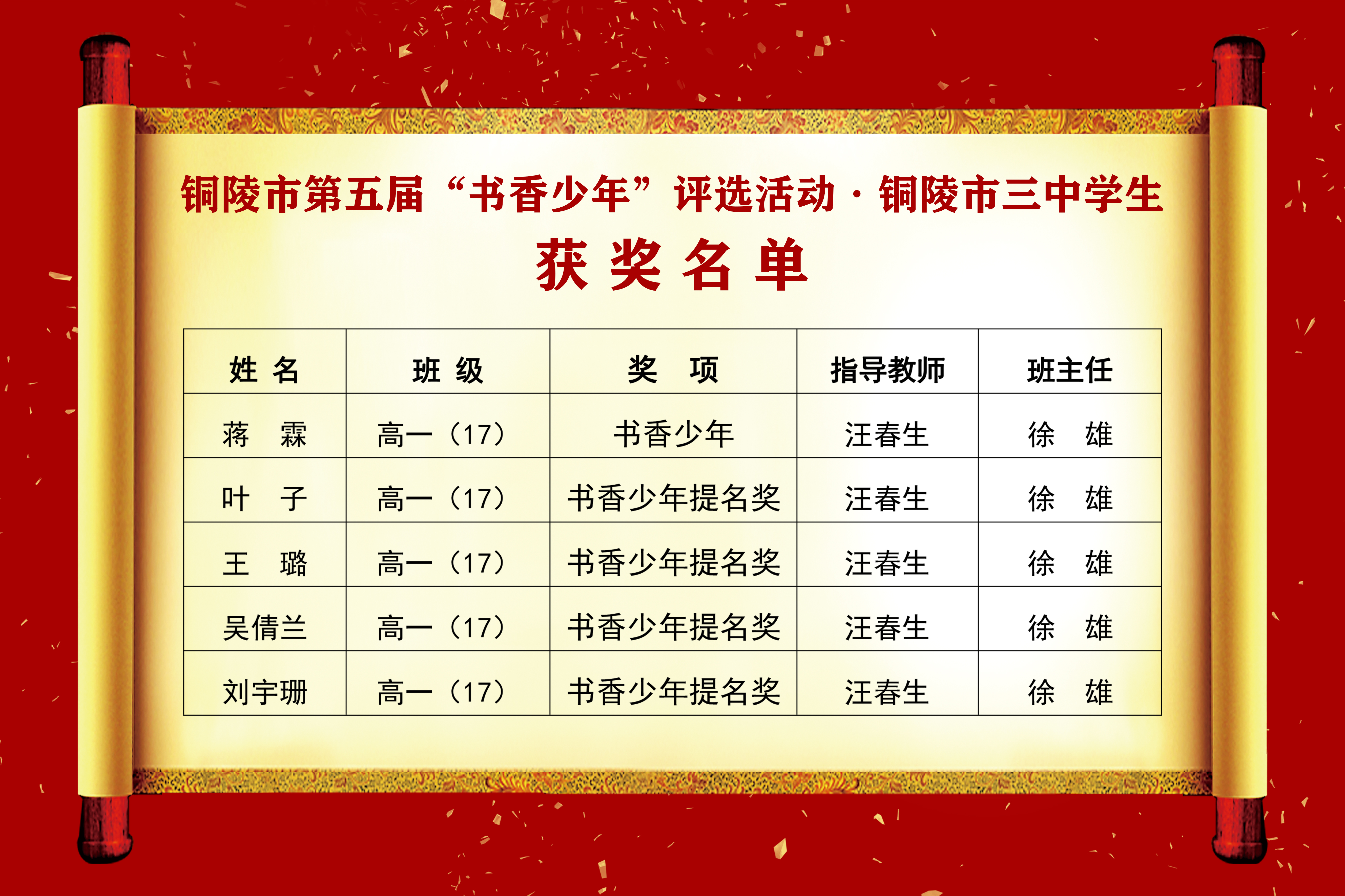 對(duì)于積極參加讀書活動(dòng)、閱讀成績(jī)優(yōu)異的學(xué)生授予“書香少年”稱號(hào)。對(duì)于積極指導(dǎo)學(xué)生參與閱讀評(píng)選活動(dòng),成績(jī)優(yōu)異的教師授予“優(yōu)秀閱讀指導(dǎo)老師”稱號(hào)。在此次“書香少年”評(píng)選活動(dòng)中,我校師生積極參加,并取得了優(yōu)異的成績(jī)。