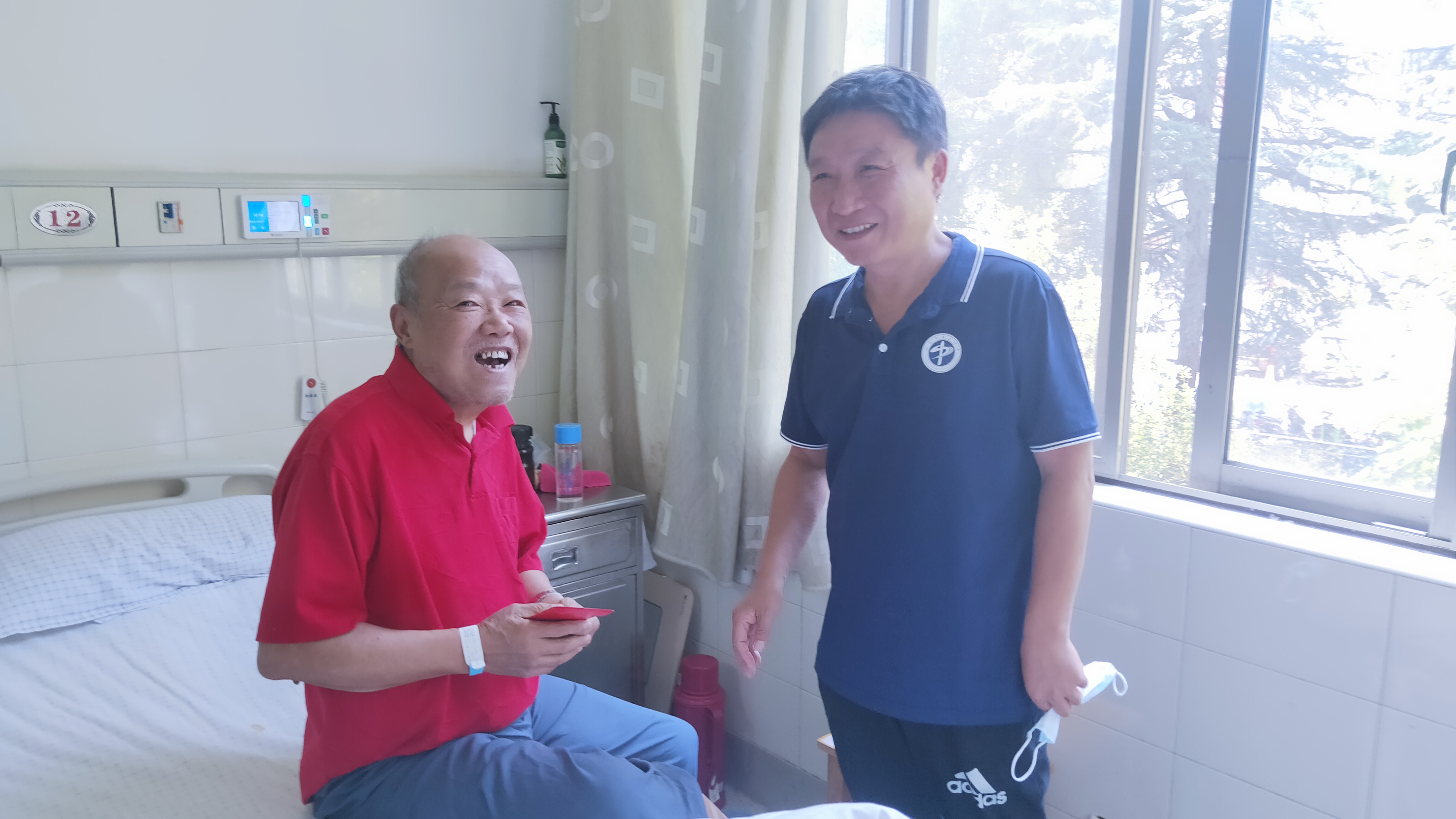 王主席拉著何老師的手仔細(xì)詢問何老的病情。何老今年已是84歲高齡,盡管因病情消瘦了許多,但言語之間依然保持一貫的樂觀與開朗。王主席叮囑何老安心休養(yǎng)。何老師感謝學(xué)校對老教師的關(guān)愛。兩人約定在重陽節(jié)秋游再次相聚。
