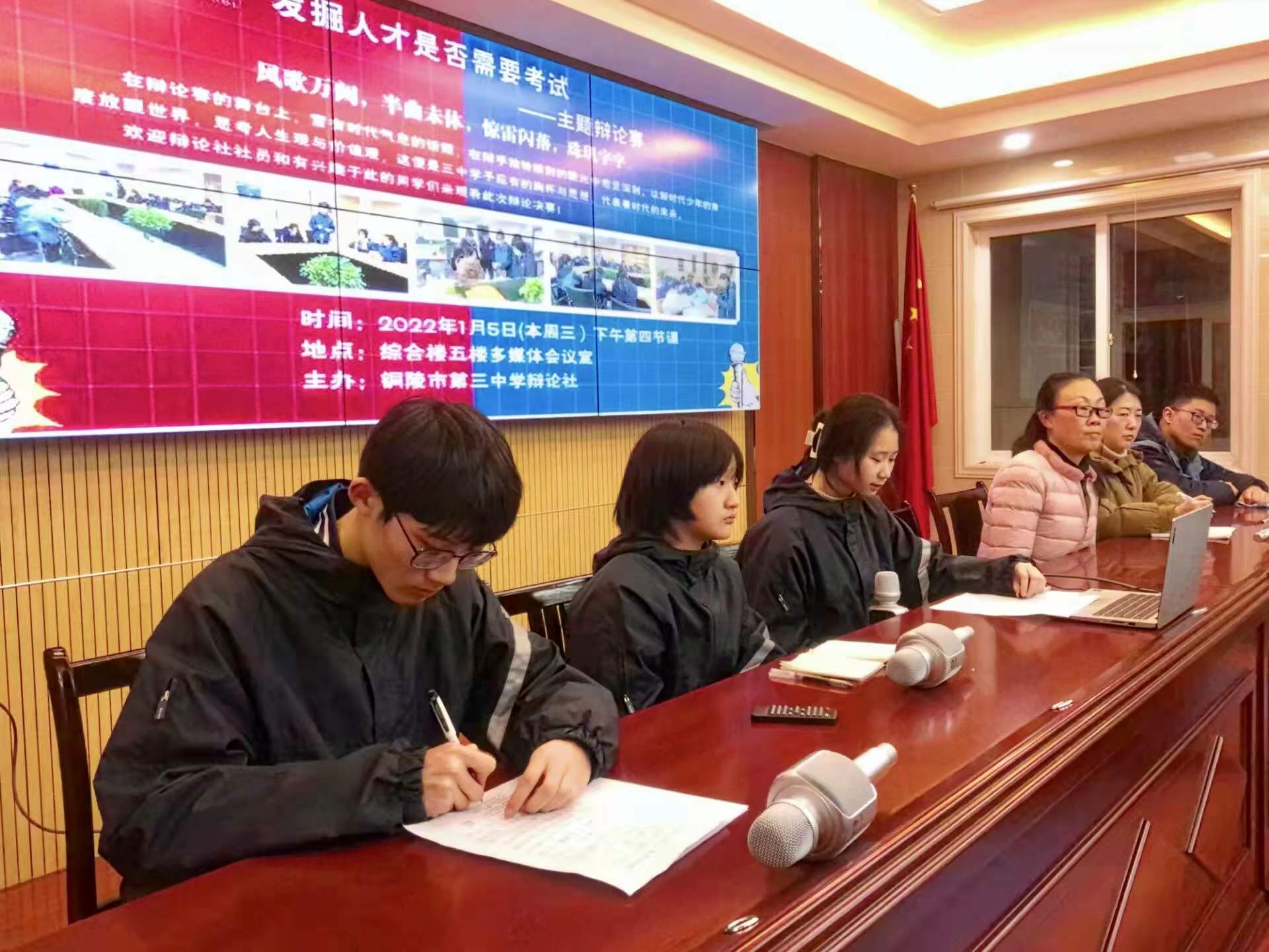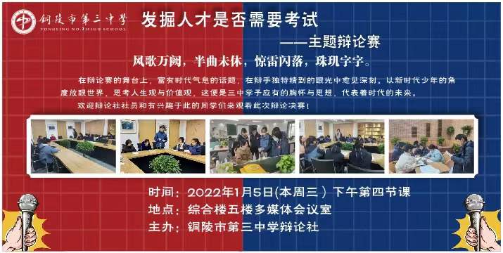 2022年1月5日下午第四節(jié)課,我校首屆校園主題辯論賽決賽在綜合樓五樓多媒體會議室舉行。本次決賽評委團(tuán)由社團(tuán)指導(dǎo)老師樊榮和徐云、朗誦社社長周祺同學(xué)、辯論社優(yōu)秀社員樊晨晨同學(xué)組成。本次決賽的主持人是周璐社長。