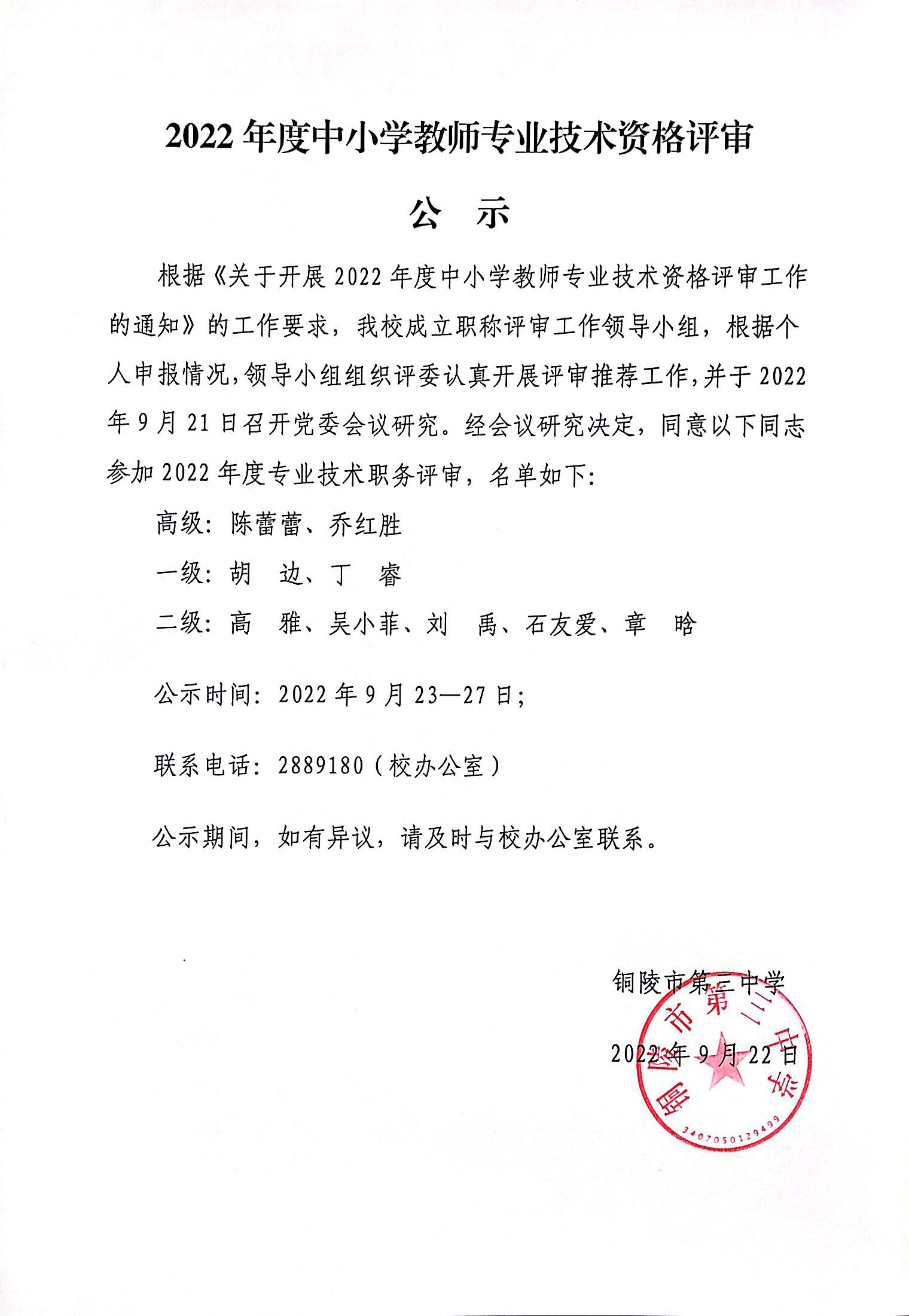 2022 年度中小學(xué)教師專業(yè)技術(shù)資格評審公示