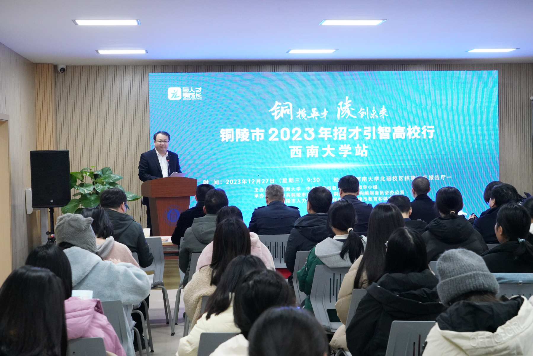 27日上午,工作組一行赴西南大學(xué)進(jìn)行宣傳,推介會上,西南大學(xué)黨委副書記黃杰代表西南大學(xué)致辭;銅陵市委常委、組織部部長鄭剛作市情推介;市委組織部副部長、人社局局長都斌作銅陵市人才政策推介;市教體局黨委書記、局長楊賢介紹銅陵市教育改革和發(fā)展情況。