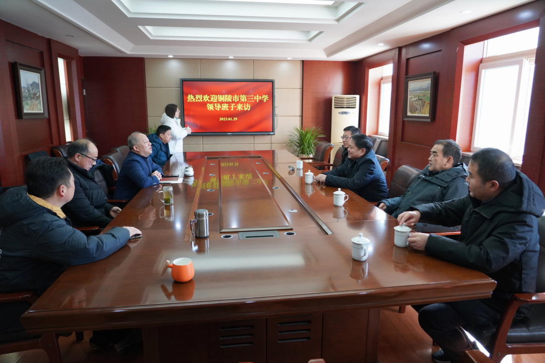 1月29日上午,校黨委副書記、副校長王合進,校黨委副書記張國榮,校黨委委員、副校長徐松成,校黨委委員、副校長章學標,辦公室主任梁波一行赴銅陵一中參觀訪問。銅陵一中黨委書記、校長汪小平攜領導班子成員熱情接待了我校一行,雙方互致問候,傳遞新年祝福。
