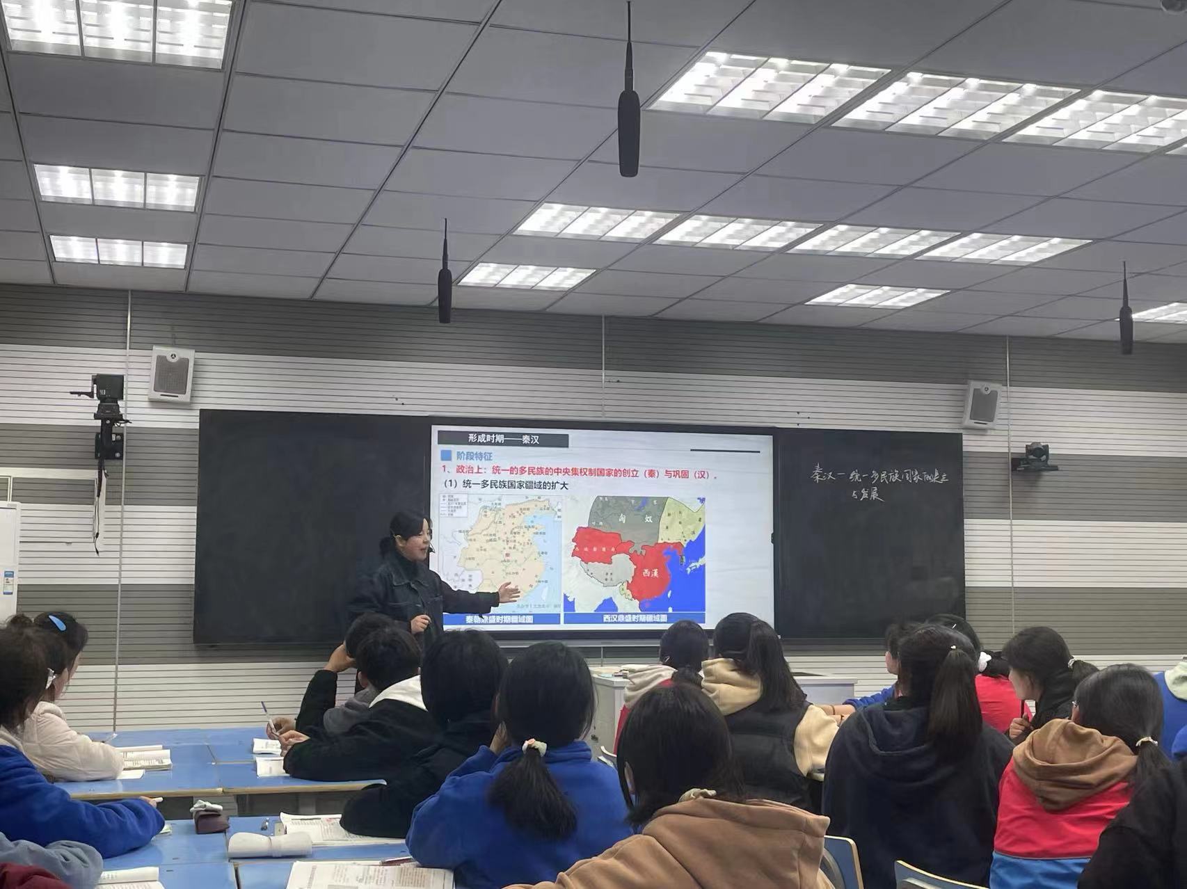 本次公開課由歷史組青年教師王毛毛執(zhí)教,針對《秦漢統(tǒng)一多民族國家的確立與發(fā)展》這一專題展開了二輪復(fù)習課的講授。王老師精心準備,以統(tǒng)一、多民族、中央集權(quán)為線索對秦漢時期的階段特征展開闡述,首尾呼應(yīng),課堂氣氛較活躍。