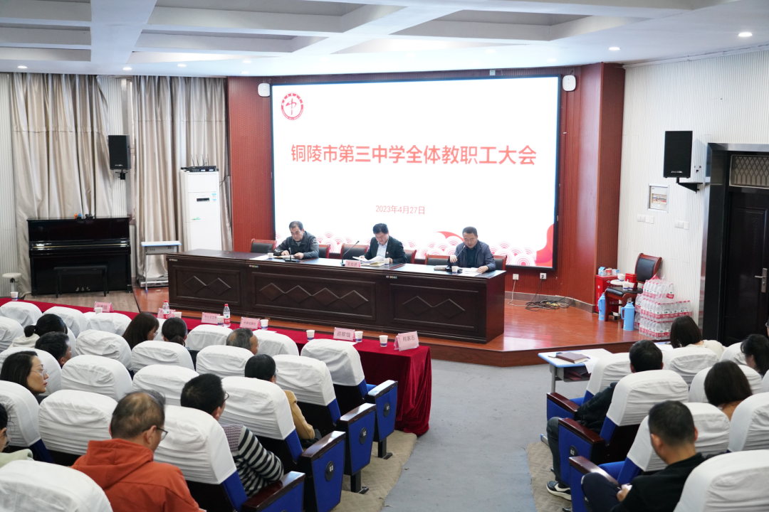 4月27日下午,銅陵三中全體教職工大會在多功能廳召開,校黨委副書記、副校長王合進,副書記張國榮,黨委委員、副校長章學標出席大會,全體教職員工240余人參加大會,王合進主持大會。
