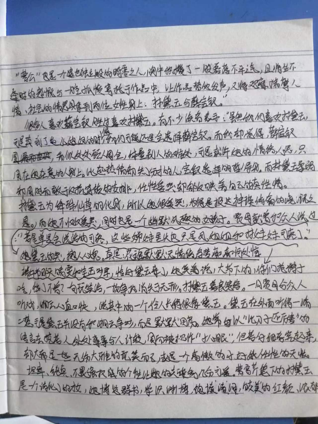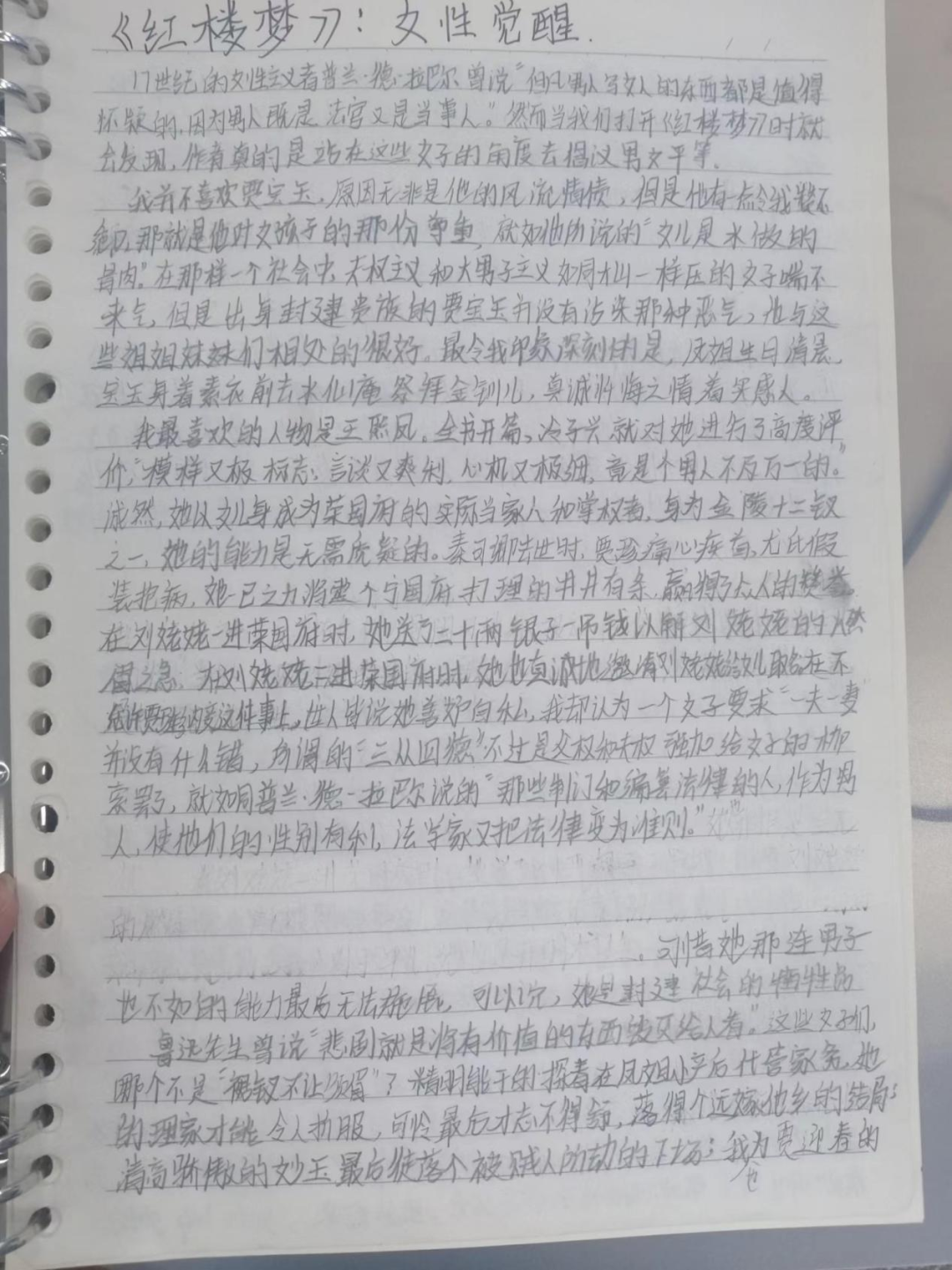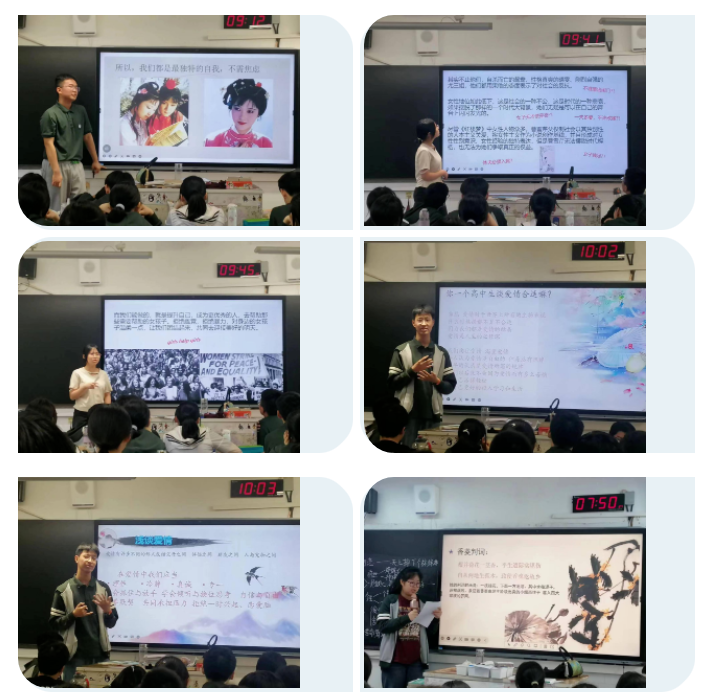 一開始還有點擔(dān)心同學(xué)們不愿讀不愿寫,但結(jié)果證明學(xué)生的興趣遠(yuǎn)遠(yuǎn)被低估了。他們自己寫稿,有條件的還做PPT。同學(xué)們發(fā)散思維,有分析人物形象的,有講解作者生平背景的,有研究紅樓夢真正結(jié)局的,有談紅樓夢的宿命感的。最令人驚喜的是大家根據(jù)文本內(nèi)容結(jié)合自己的所見所聞,延伸出很多與當(dāng)今社會息息相關(guān)的感想:如談及女性權(quán)利、獨立人格,如通過分享不公平的社會案例來談公平,如談紅樓女子的高情商,還有的淺談愛情觀等。在分享會中,涉及不少時髦的詞匯,如“拒絕雌競”、“拒絕女性區(qū)別對待”、“girls help girls”、不要“容貌焦慮”,每個人都是最獨特的自我等,傳達(dá)出積極健康的新時代價值觀,令同學(xué)們沉浸在聆聽中,并由衷地為分享者鼓掌、點贊,每每說到與當(dāng)下相聯(lián)系的進步價值觀時往往引起同學(xué)們山呼海嘯般地歡呼與叫好,現(xiàn)場氣氛熱烈,高潮迭起。