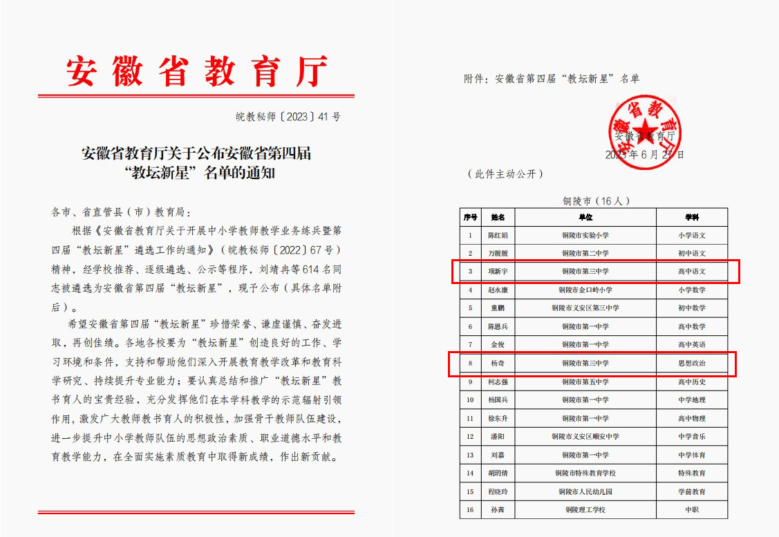 實(shí)錘了!銅陵三中再添一喜!熱烈祝賀我校項(xiàng)新宇、楊奇兩位老師榮獲安徽省第四屆“教壇新星”榮譽(yù)稱號(hào)。