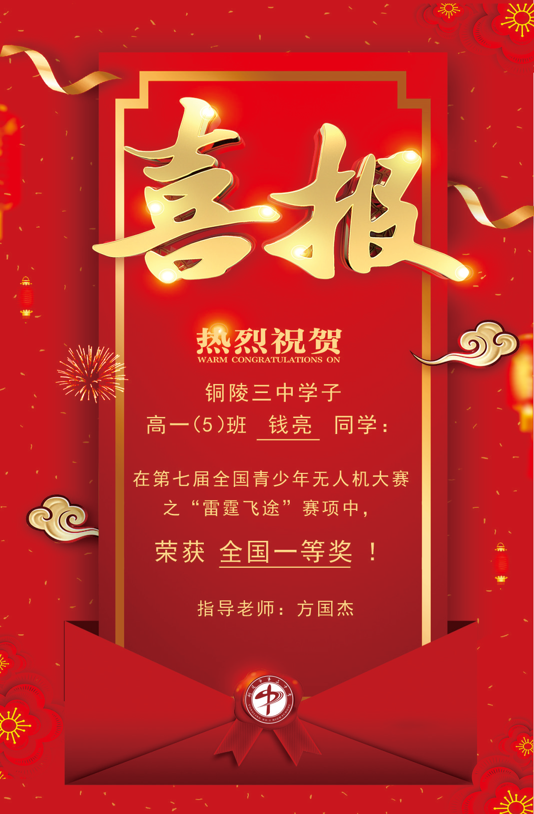 2023年8月10日至8月13日第七屆全國青少年無人機大賽在美麗的山城重慶舉行。經過激烈角逐,我校高一(5)班錢亮同學在方國杰老師的悉心指導下,在國青少年無人機大賽“雷霆飛途”賽項中斬獲全國一等獎!這是安徽省在此項賽事中獲得的最高獎項!