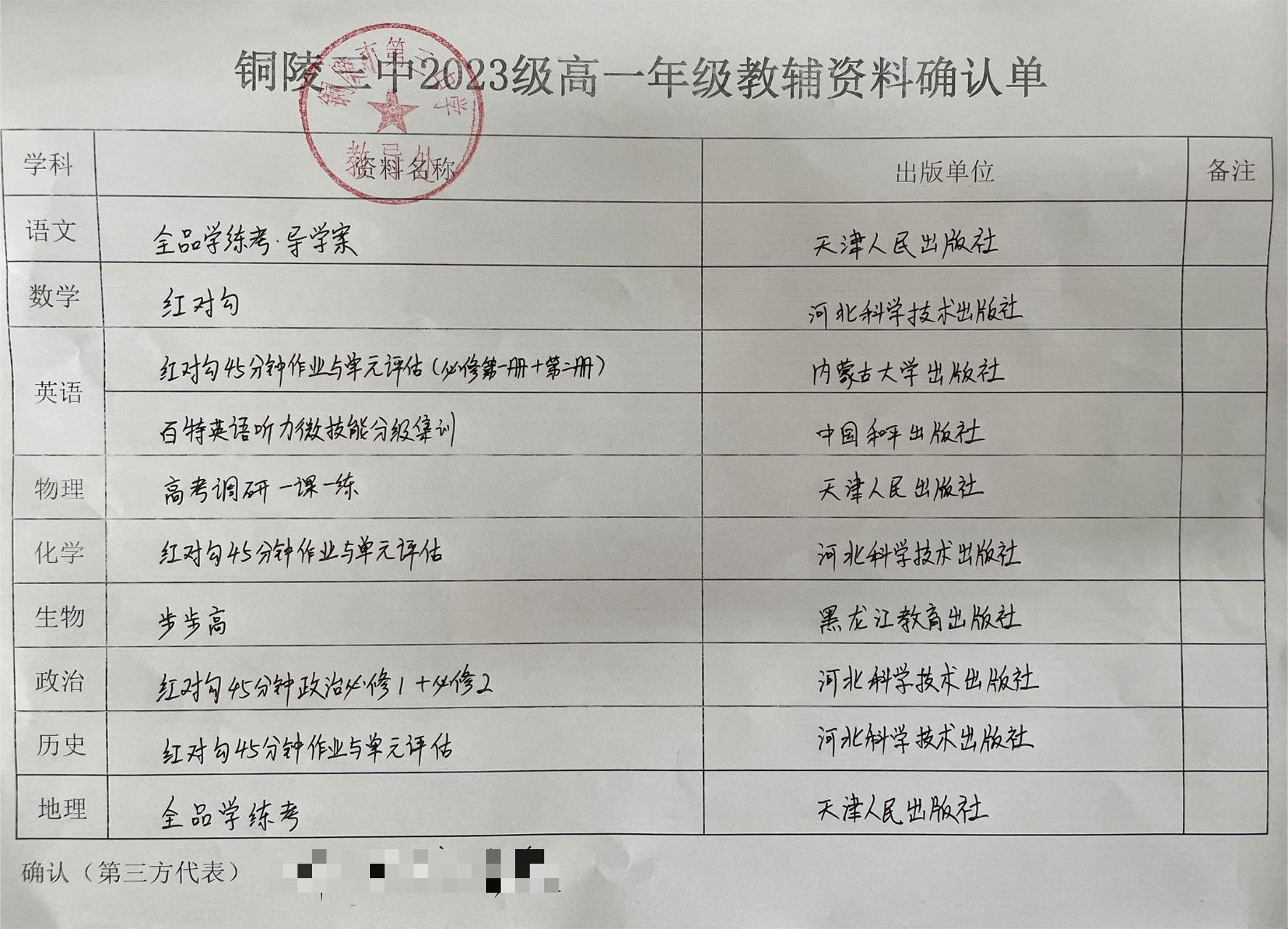 2023年8月6日—2023年8月11日,高一年級(jí)部在銅陵三中校園網(wǎng)上對(duì)本校2023級(jí)高一年級(jí)教輔資料進(jìn)行公開招標(biāo)。近日對(duì)投標(biāo)單位進(jìn)行資格審查,符合條件的一共有4家單位,符合開標(biāo)要求。評(píng)議小組對(duì)符合條件的單位提供的教輔資料進(jìn)行現(xiàn)場(chǎng)打分,年級(jí)部家長(zhǎng)代表現(xiàn)場(chǎng)拆封資料報(bào)價(jià)單,并做出選擇,確定選擇以下資料提供給各班級(jí)學(xué)生選擇使用,現(xiàn)將具體情況公示如下: