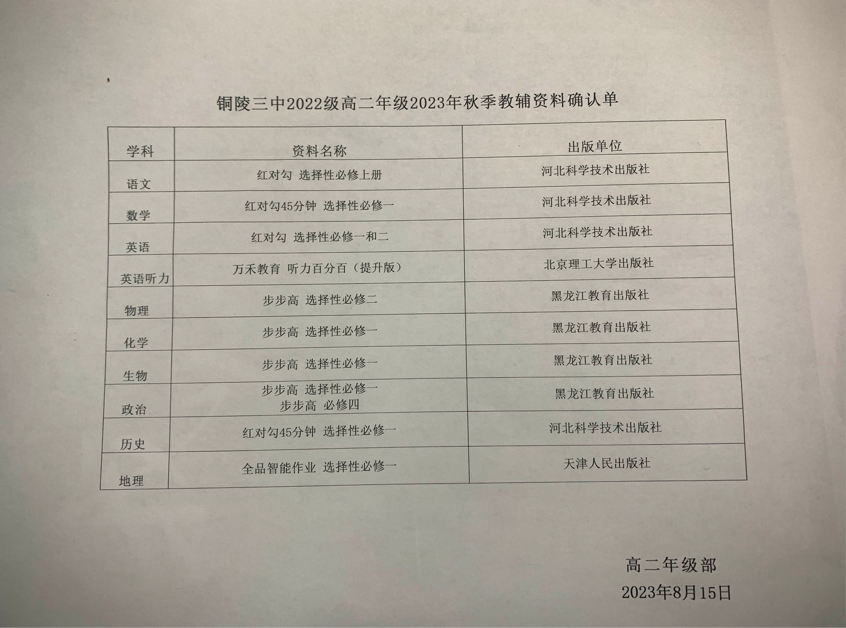 2023年8月7日—2023年8月14日,高二年級(jí)部在銅陵三中校園網(wǎng)上對(duì)本校2022級(jí)高二年級(jí)教輔資料進(jìn)行公開招標(biāo)。近日對(duì)投標(biāo)單位進(jìn)行資格審查,符合條件的一共有5家單位,符合開標(biāo)要求。評(píng)議小組對(duì)符合條件的單位提供的教輔資料進(jìn)行現(xiàn)場打分,年級(jí)部家長代表現(xiàn)場拆封資料報(bào)價(jià)單,并做出選擇,確定選擇以下資料提供給各班級(jí)學(xué)生選擇使用,現(xiàn)將具體情況公示如下: