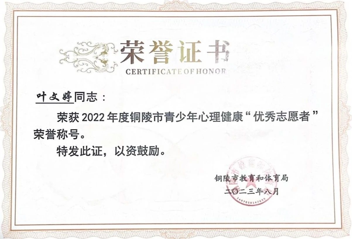 根據(jù)市教體局《關(guān)于命名首批銅陵市中小學(xué)心理健康教育示范校的通報》(銅教體宣〔2023〕5號)要求,經(jīng)集體申報、綜合調(diào)研、組織評審,共產(chǎn)生11所銅陵市心理健康教育示范校,我校位列其中。8月17日上午,首批銅陵市中小學(xué)心理健康教育示范學(xué)校授牌儀式在市十五中東校區(qū)隆重舉行,我校獲市教體局“銅陵市中小學(xué)心理健康教育示范學(xué)校”授牌。同時,我校專職心理健康教師葉文婷獲得2022年度銅陵市青少年心理健康“優(yōu)秀志愿者”榮譽(yù)稱號。