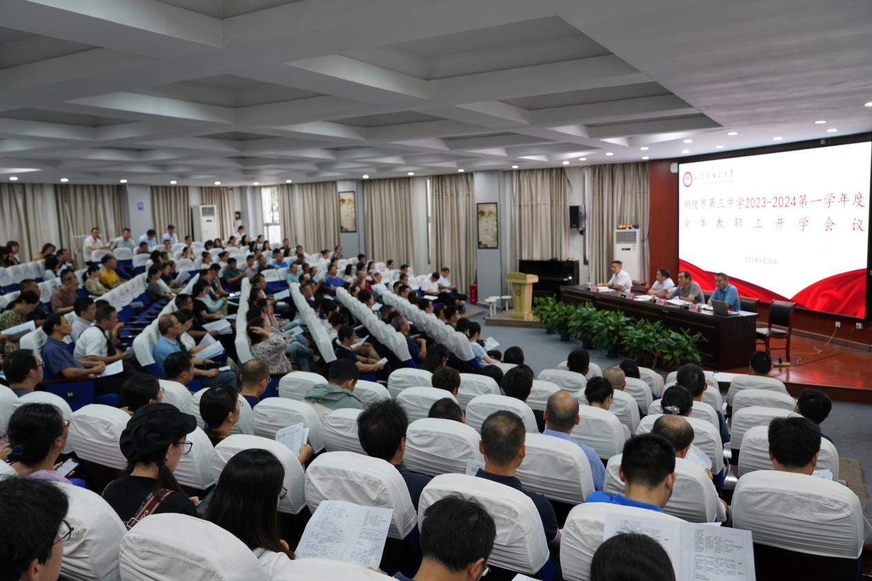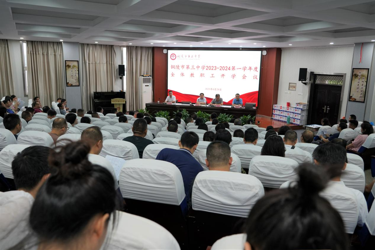闊別一個(gè)假期,銅陵三中校園又重新忙碌起來。8月28日上午,2023——2024年第一學(xué)年度全體教職工大會(huì)在多功能廳召開,校黨委副書記、副校長王合進(jìn),副書記張國榮,黨委委員、副校長徐松成,黨委委員、副校長章學(xué)標(biāo)出席大會(huì),全體教職員工約240人參加大會(huì),張國榮主持大會(huì)。