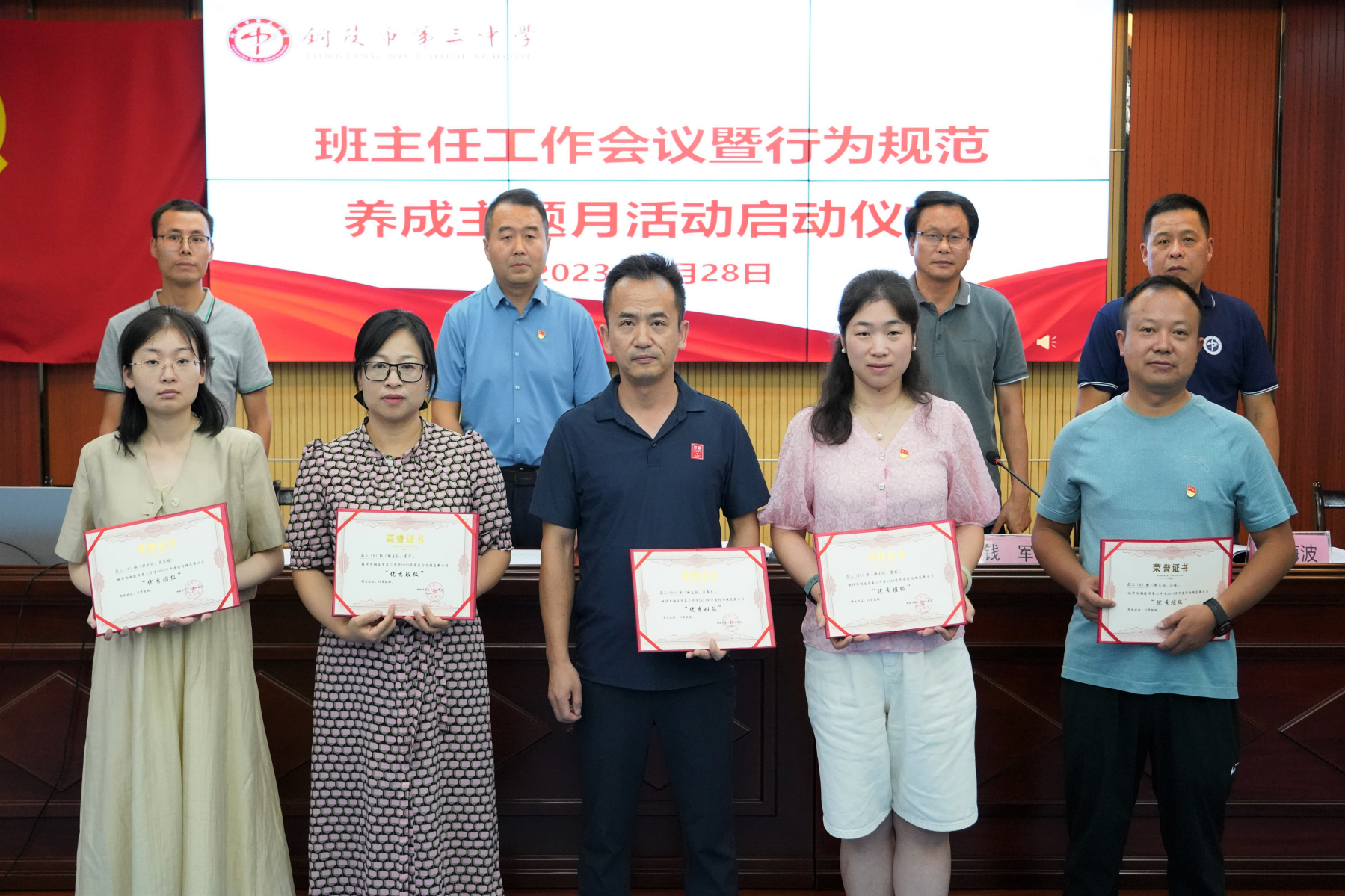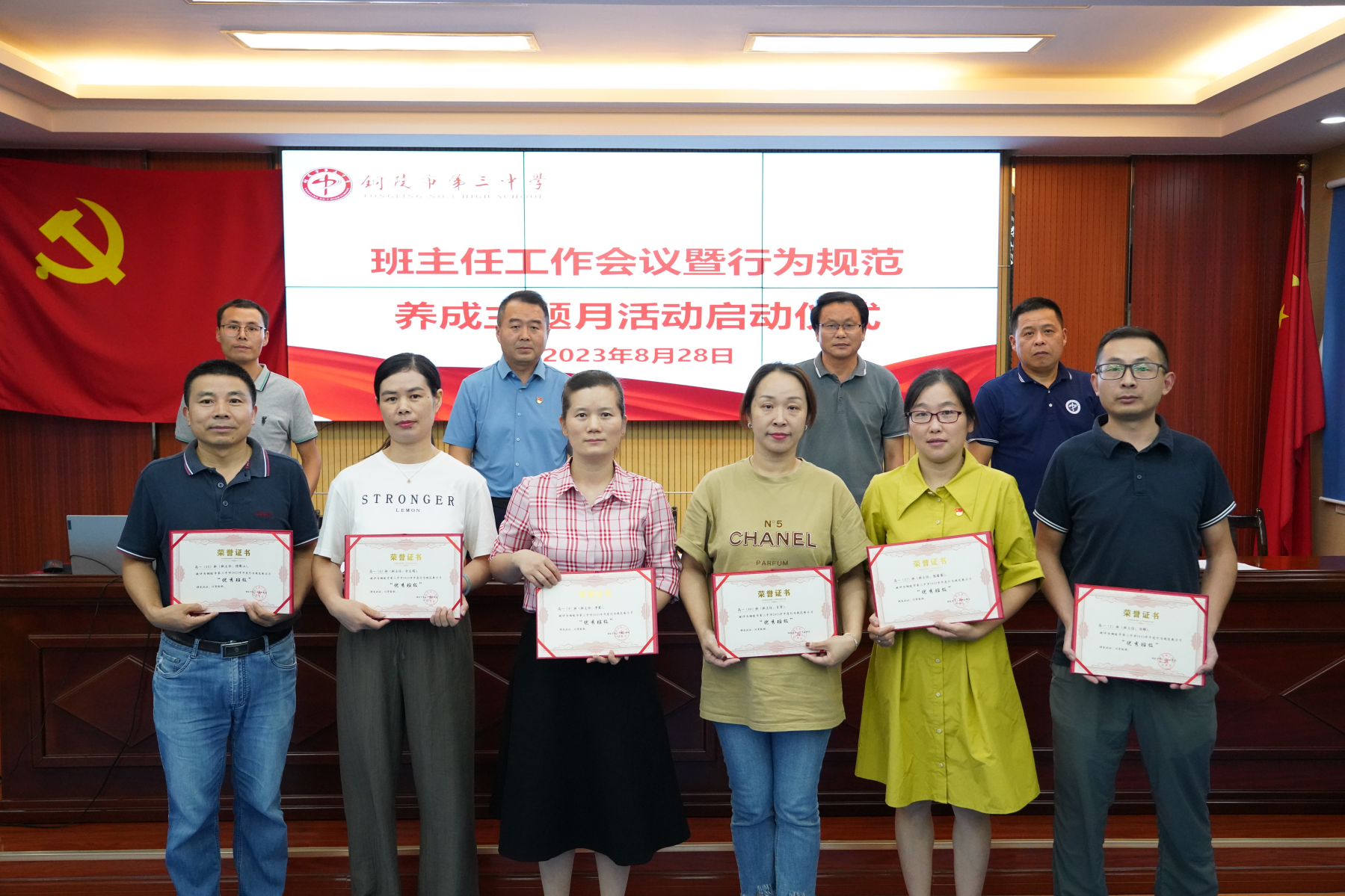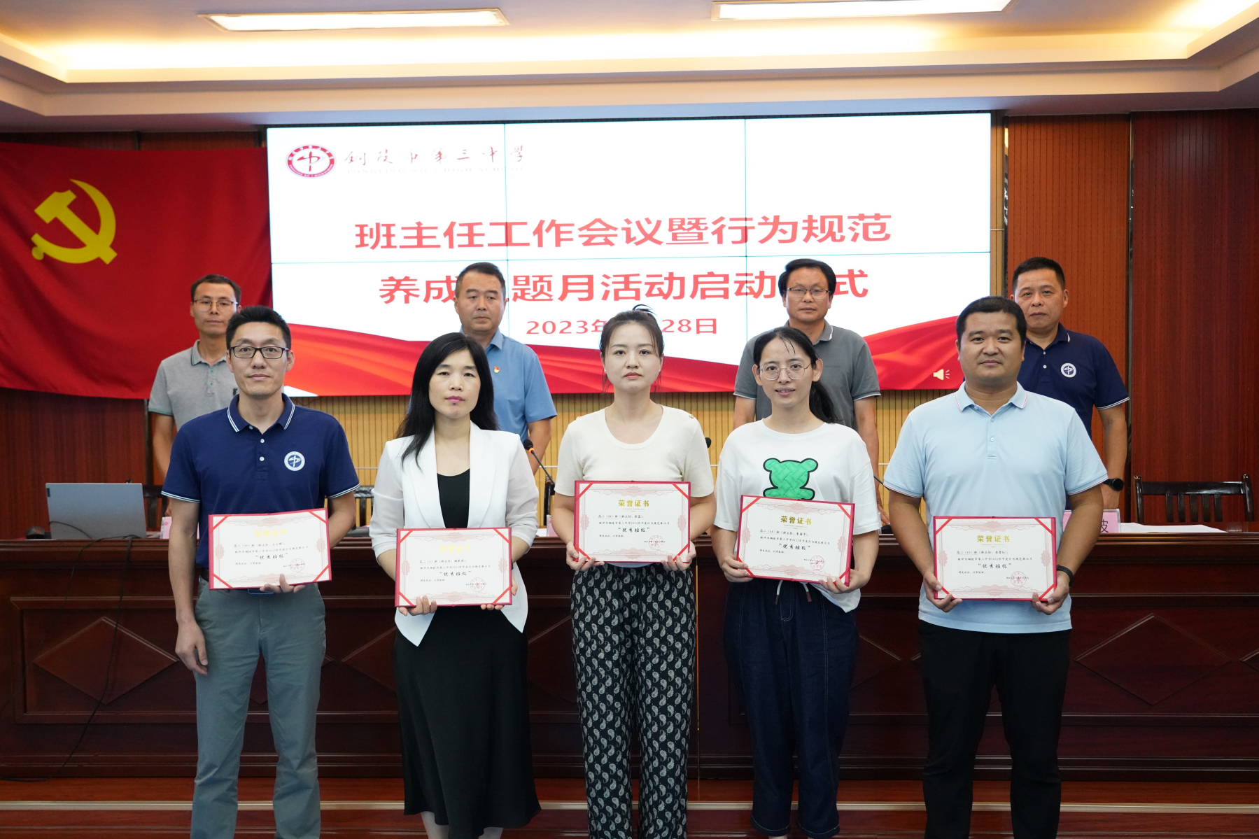 章學標宣讀上學期班主任工作手冊及家訪優(yōu)秀班主任名單、行為規(guī)范風采展示月優(yōu)秀班級名單,與會校領導們共同為獲獎班主任和班級頒發(fā)榮譽證書。