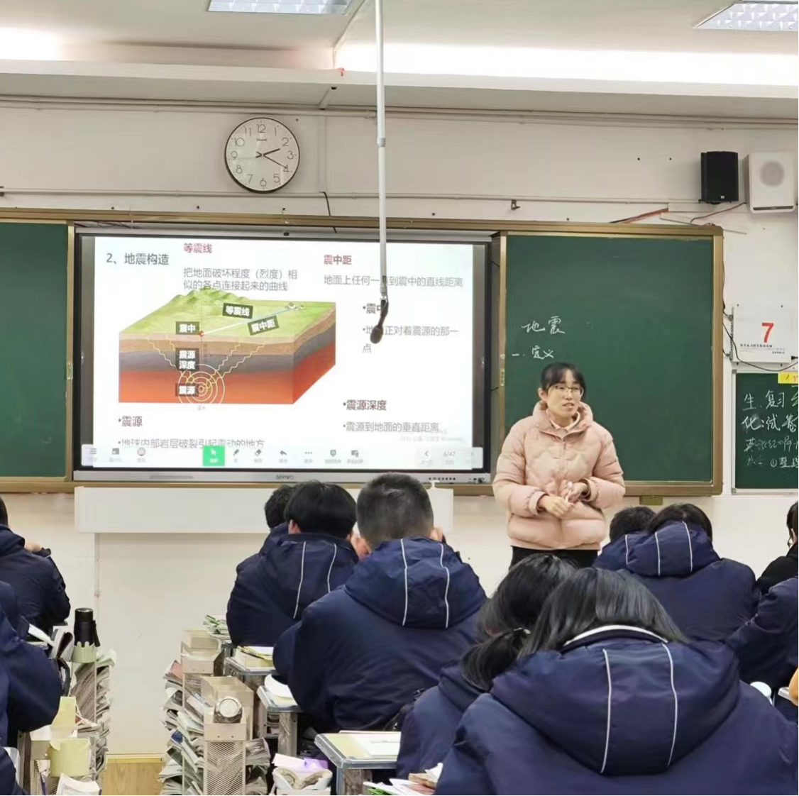 在課堂教學(xué)中,曹老師以2023.12.18甘肅積石山地震為真實情境,在學(xué)習(xí)了地震的概念、成因和構(gòu)造后,讓同學(xué)們合作探究烈度和震級的區(qū)別,同時根據(jù)材料總結(jié)積石山烈度大的原因以及地震的危害,接下來在地震分布角度分析了中國地震多發(fā)的原因,以此帶領(lǐng)學(xué)生討論地震中的自救措施。問題設(shè)置層層遞進,教學(xué)環(huán)節(jié)過渡自然,教學(xué)情境引人入勝,課堂氛圍生動活潑。