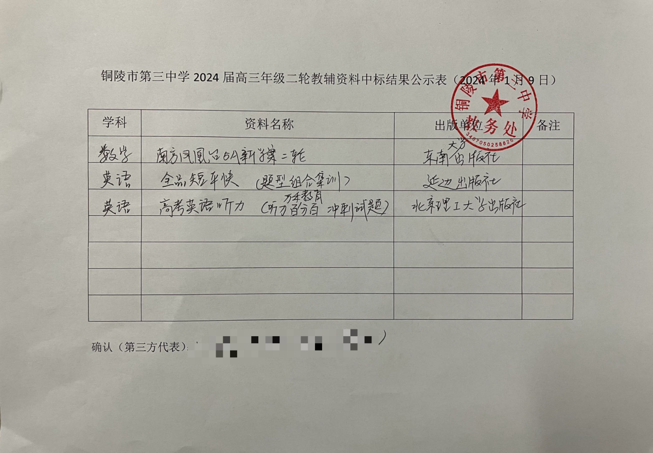 2024年1月4日—2024年1月7日,高三年級部在銅陵三中校園網(wǎng)上對本校2024屆高三年級二輪部分教輔資料進行公開招標。2024年1月9日對投標單位進行資格審查,符合條件的一共有3家單位,符合開標要求。評議小組對符合條件的單位提供的教輔資料進行打分,年級部家長代表現(xiàn)場拆封資料報價單,并做出選擇,確定選擇以下資料提供給各班級學生選擇使用,現(xiàn)將具體情況公示如下: