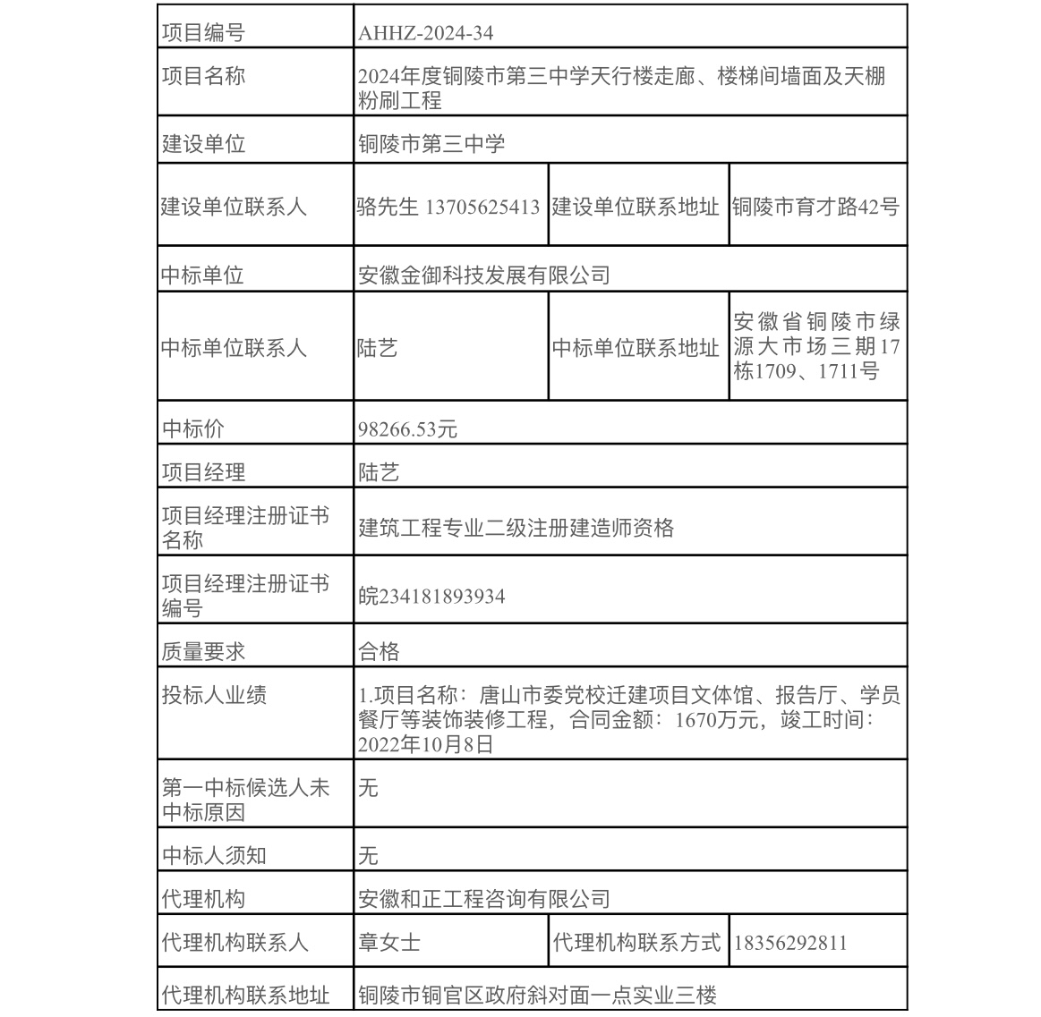 2024年度銅陵市第三中學(xué)天行樓走廊、樓梯間墻面及天棚粉刷工程中標(biāo)結(jié)果公示