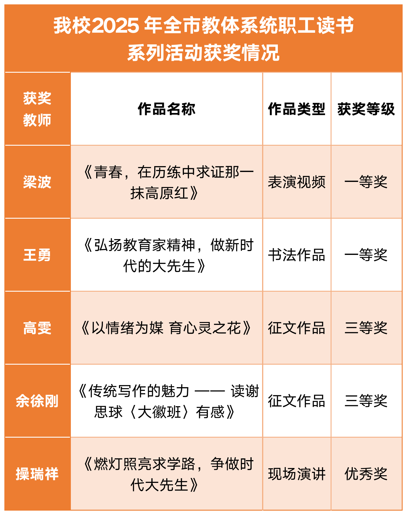 近日,銅陵市教育和體育局公布了2025年全市教體系統(tǒng)職工“弘揚(yáng)教育家精神·做新時代‘大先生’”讀書系列活動評比結(jié)果。我校教師積極參與,表現(xiàn)優(yōu)異,在多個類別中斬獲佳績,展現(xiàn)了新時代教師隊(duì)伍的良好精神風(fēng)貌與扎實(shí)文化素養(yǎng)。