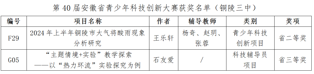 第40屆安徽省青少年科技創(chuàng)新大賽獲獎(jiǎng)名單(銅陵三中)