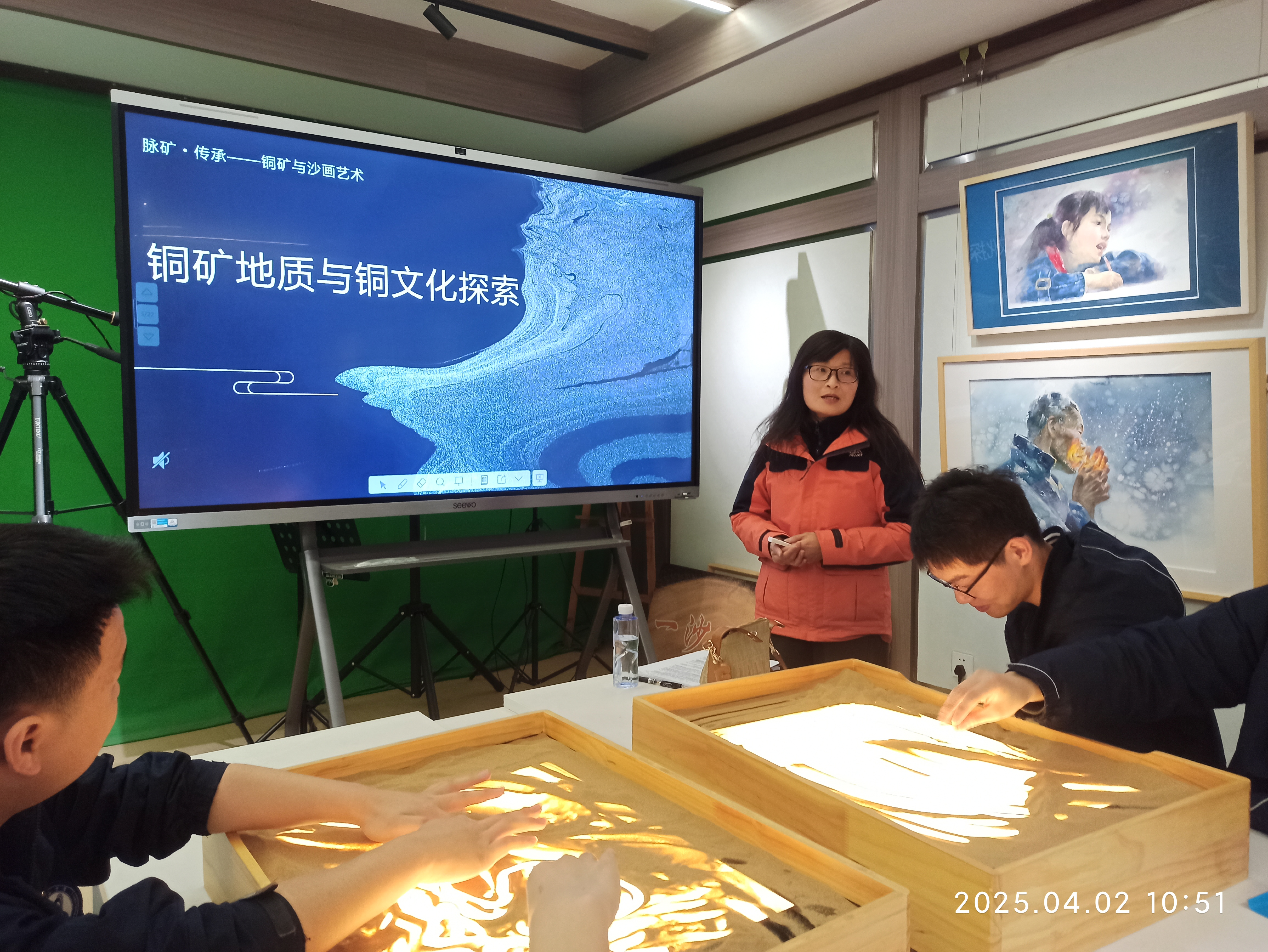 開頭部分,梁波老師以動態(tài)沙畫視頻為引,帶領學生感受沙畫藝術流動的雕塑之魅力。當國際沙畫作品中的光影變幻切換為李白《銅官山》中爐火照天地,紅星亂紫煙的冶煉場景時,學生們驚嘆于傳統(tǒng)詩詞與現(xiàn)代藝術的共鳴。銅礦開采的流動感與沙畫的動態(tài)變化天然契合,這是獨屬銅陵的文化表達。