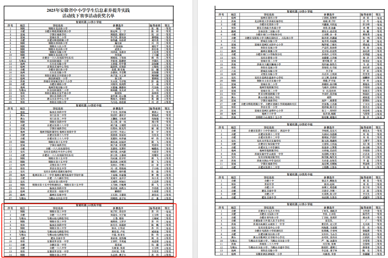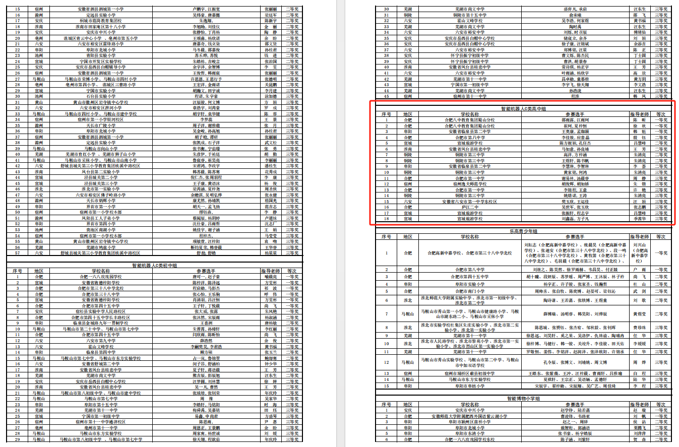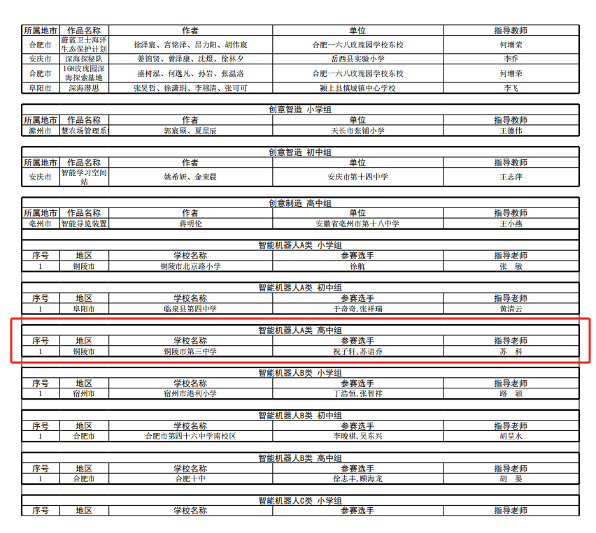 其中,祝子軒同學(xué)在A 類機(jī)器人項(xiàng)目中獲得冠軍,將代表安徽省參加全國(guó)學(xué)生信息素養(yǎng)交流活動(dòng)。