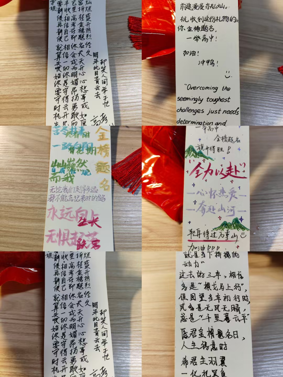 這不僅是一次勞動實(shí)踐,更承載著濃濃的溫情與祝福。同學(xué)們將包好的粽子整齊擺放,并在特制書簽上寫下對高三學(xué)長學(xué)姐的真摯寄語:“愿筆鋒所至,夢想開花”“粽有千般好,高考一定贏”,一句句暖心話語傳遞著青春的美好期許。