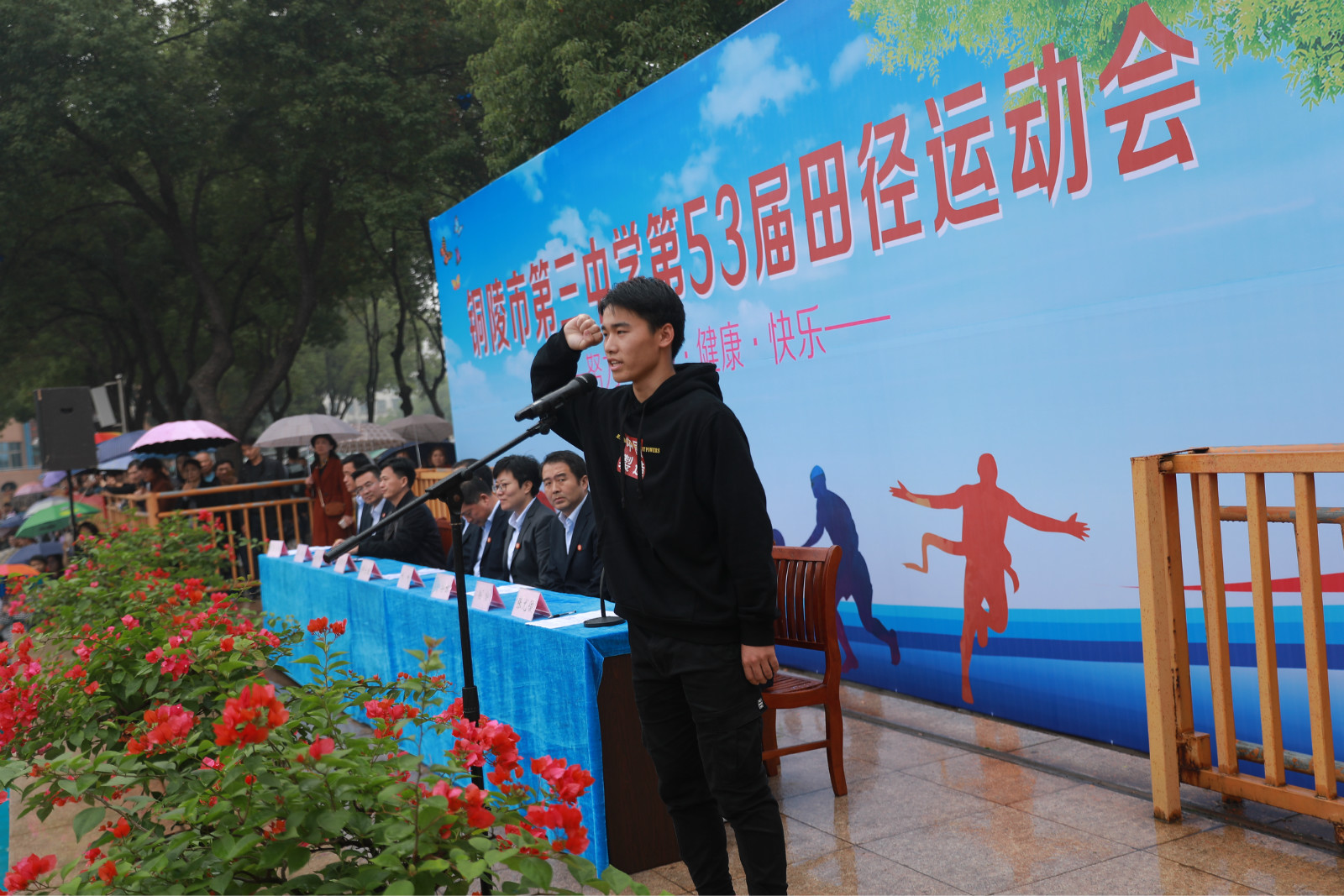 本校訊 10月25日上午,小雨柔柔,盡管天公不太給力,但三中的師生們格外賣力,倍受關(guān)注的銅陵市第三中學(xué)第53屆田徑運(yùn)動(dòng)會(huì)在體育操場(chǎng)開幕。銅陵三中黨委書記、校長(zhǎng)鐘士標(biāo),結(jié)對(duì)友好學(xué)校樅陽(yáng)湯溝中學(xué)副校長(zhǎng)祖學(xué)進(jìn),銅陵三中副校長(zhǎng)葉葉,銅陵三中副校長(zhǎng)張國(guó)榮等領(lǐng)導(dǎo)出席開幕式,第53屆運(yùn)動(dòng)會(huì)組委會(huì)成員及廣大師生觀看了開幕式,開幕式由銅陵三中教務(wù)處主任張尤俊主持。