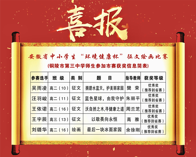為全面提高公眾對氣候變化與健康關(guān)系的認(rèn)知度,推進(jìn)實(shí)施《健康中國行動(2019-2030)》,提升中小學(xué)生參與應(yīng)對氣候變化相關(guān)活動的意愿,銅陵市疾控中心和銅陵市教體局聯(lián)合開展“環(huán)境健康杯”征文繪畫比賽,我校4名學(xué)生的征文作品和1名學(xué)生的繪畫作品榜上有名,推送至省組委會。