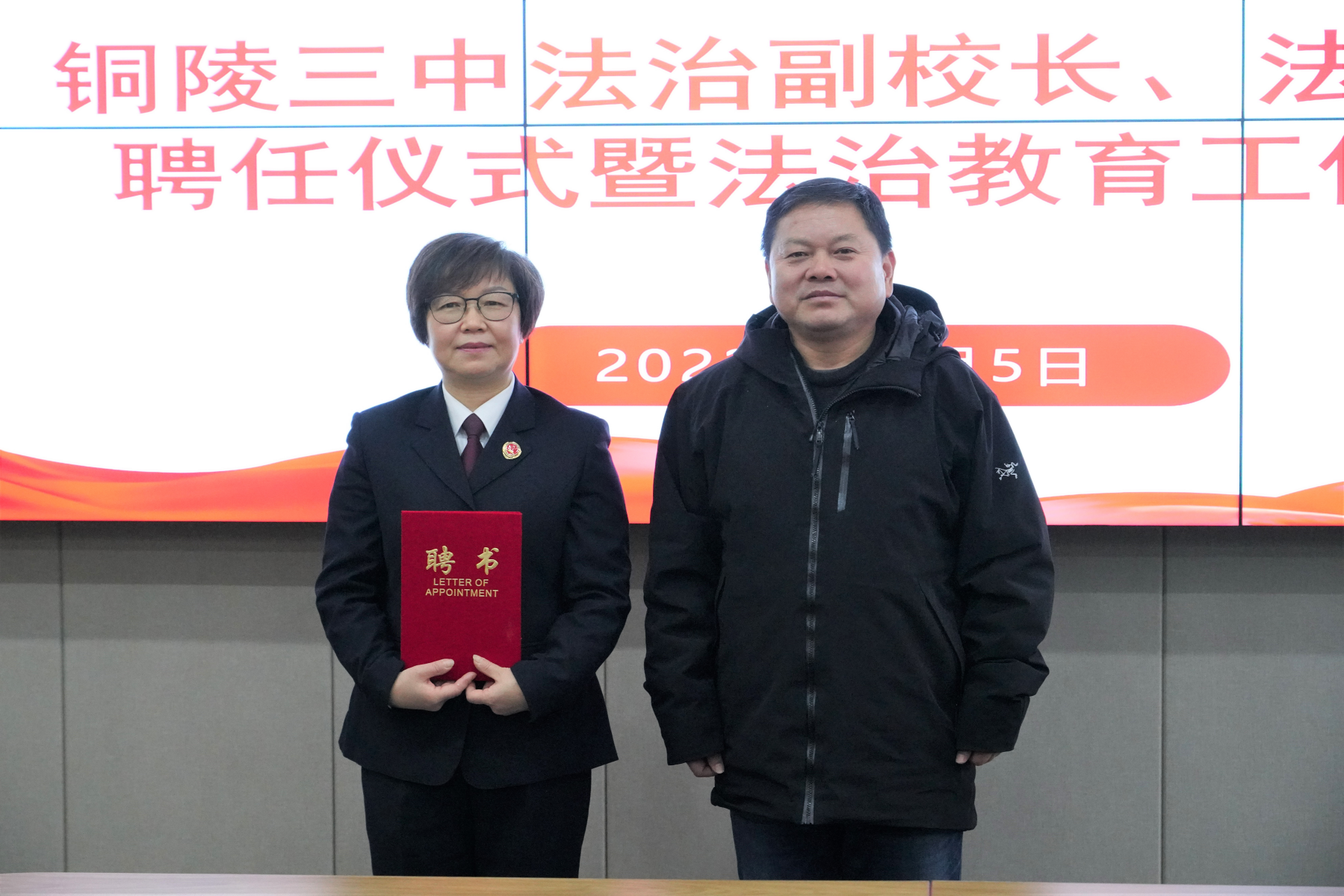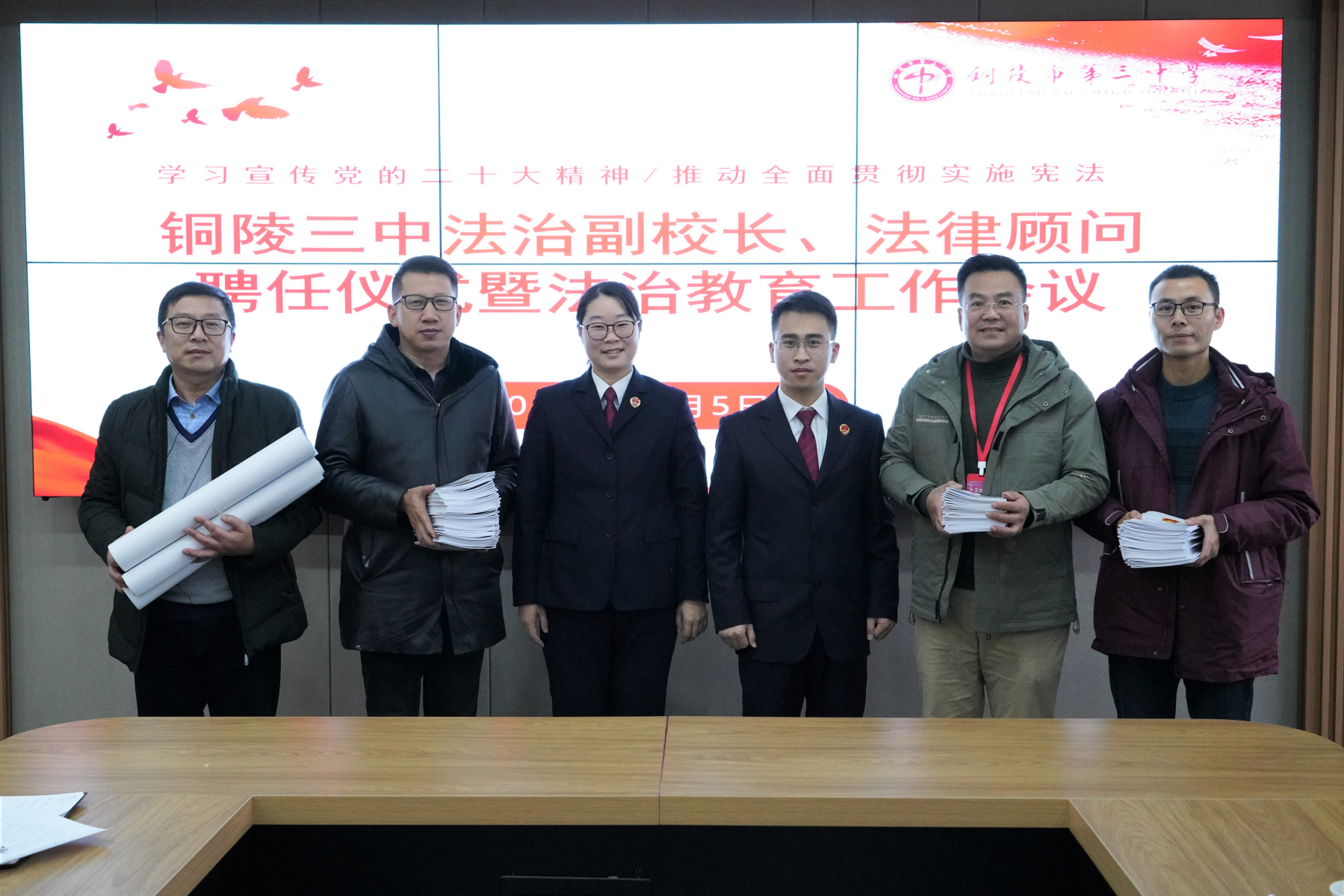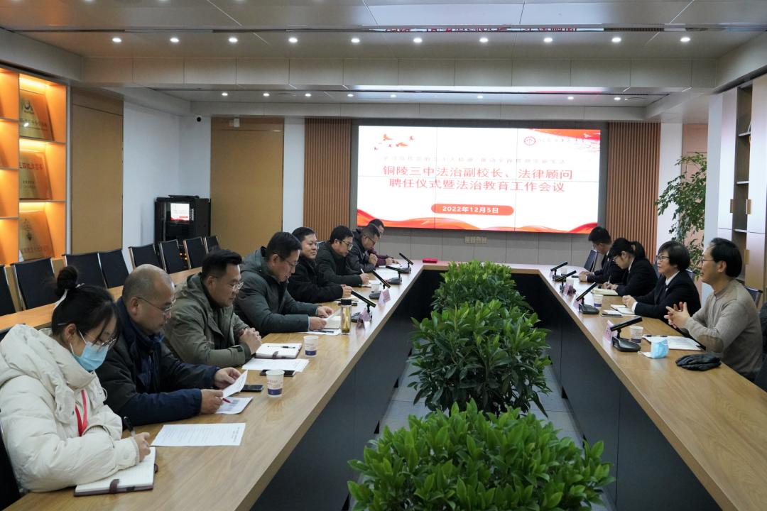 12月5日下午,銅陵三中法治副校長、法律顧問聘任儀式暨法治教育工作會(huì)議在躬行樓五樓會(huì)議室舉行,校黨委副書記、副校長王合進(jìn),市檢察院副檢察長、三中法治副校長胡錦華,校黨委委員、副校長徐松成,徽風(fēng)律師事務(wù)所主任朱年友,市檢察院第一檢察部(未成年人檢察工作辦公室)檢察官周姍姍、呂星及我校相關(guān)部門負(fù)責(zé)人出席會(huì)議。徐松成主持會(huì)議。