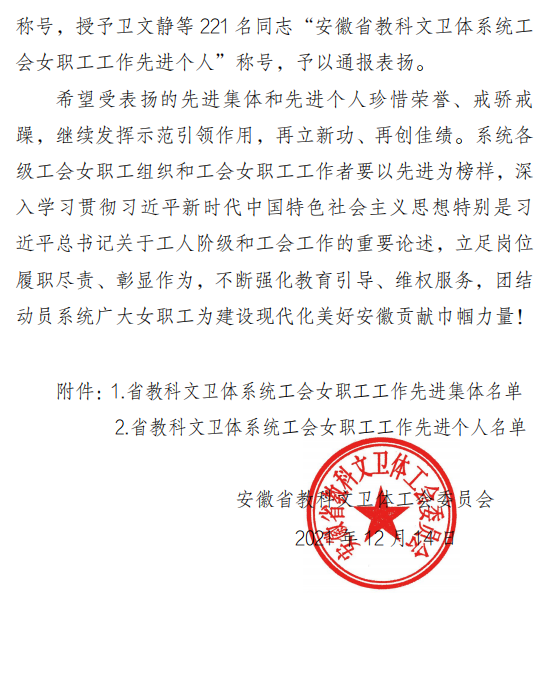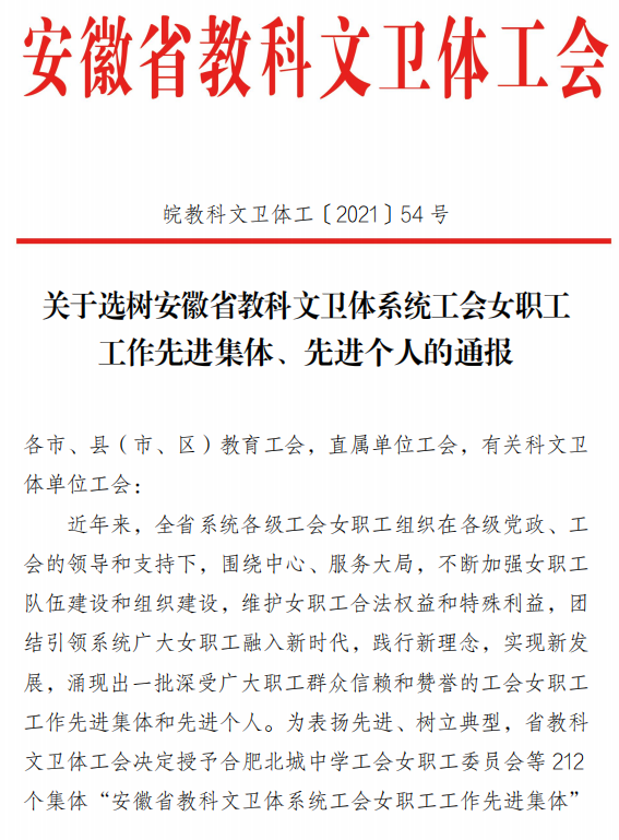 安徽省教科文衛(wèi)體工會皖教科文衛(wèi)體工〔2021〕54 號文件通報,為表揚先進、樹立典型,省教科文衛(wèi)體工會決定授予合肥北城中學工會女職工委員會等 212 個集體“安徽省教科文衛(wèi)體系統(tǒng)工會女職工工作先進集體” 稱號,我校位列其中。