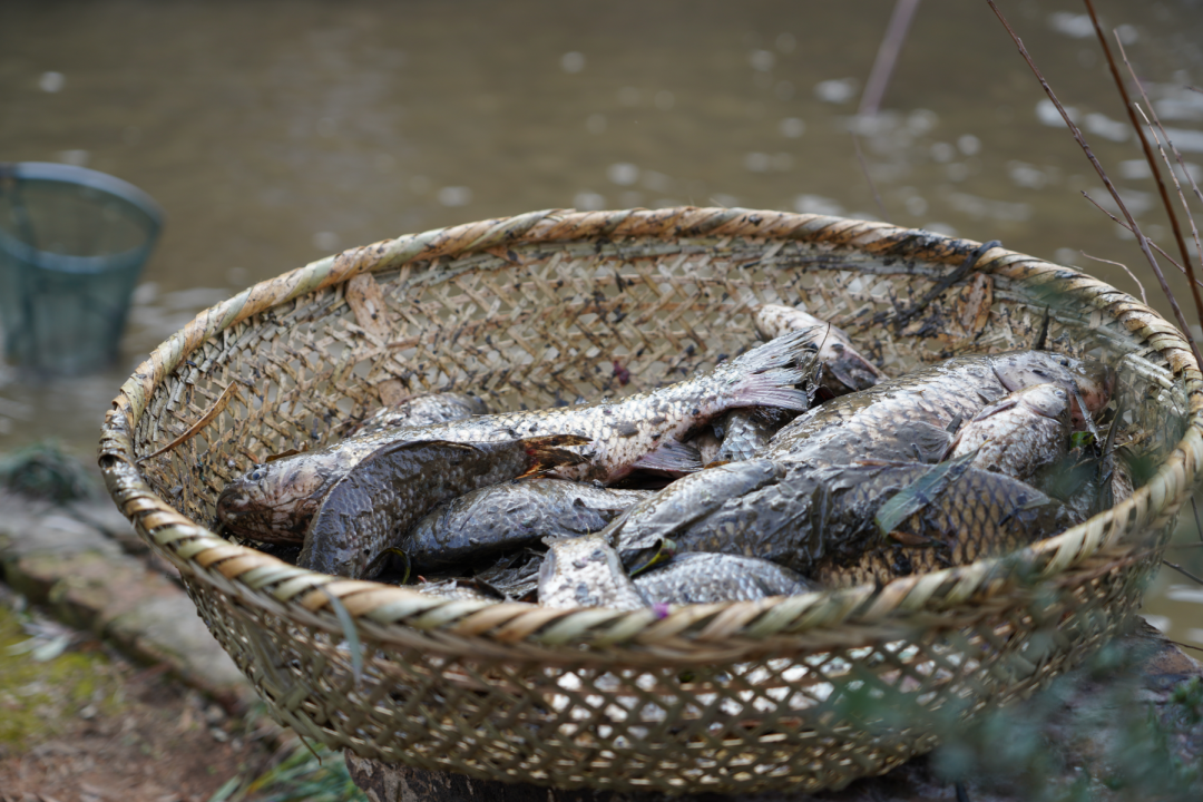 魚塘邊,熱鬧非凡,校領(lǐng)導(dǎo)與學(xué)生代表分別拿著網(wǎng)兜站在魚塘四周,用力攪動水面。隨著同學(xué)們的呼喊聲和用網(wǎng)兜攪動的水聲,一條條魚翻出水面,雪白的鱗片在陽光下閃著耀眼的銀光,大家小心翼翼,慢慢收網(wǎng),F(xiàn)場人聲鼎沸,吶喊的聲響不絕于耳。入網(wǎng)、入兜、入桶,一條條大小不一的魚被捕撈上來。經(jīng)過近半小時的勞作,收獲了上百斤的鯽魚、鰱魚和鯉魚。大家抱起大魚合影留念,記錄下難忘的幸福時光。