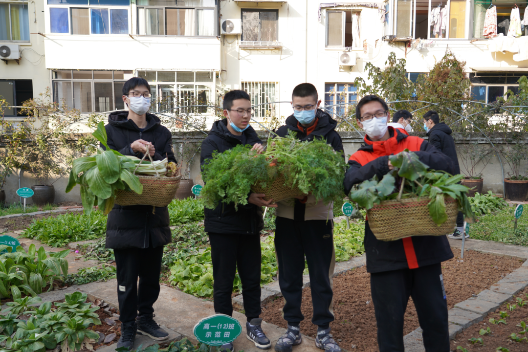 這邊捕魚忙得不亦樂乎,植物園另一邊小菜園里,同學(xué)們正在忙著采摘新鮮蔬菜,他們拿著竹籃子采青菜、摘包菜,割韭菜……每個人臉上洋溢著豐收的喜悅,歡聲笑語不時響徹校園。